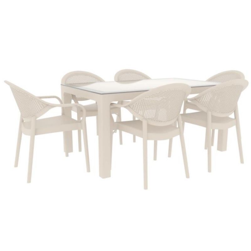 Las sillas Moon están fabricadas con una mezcla de polipropileno y fibra de vidrio mediante un sistema de inyección de gas. El conjunto incluye 6 sillas Moon y 1 mesa Arizona Wood con tapa de vidrio templado de 5 mm (90×150 cm). Apto para uso tanto en interiores como en exteriores. Todos los productos se entregan embalados en caja.