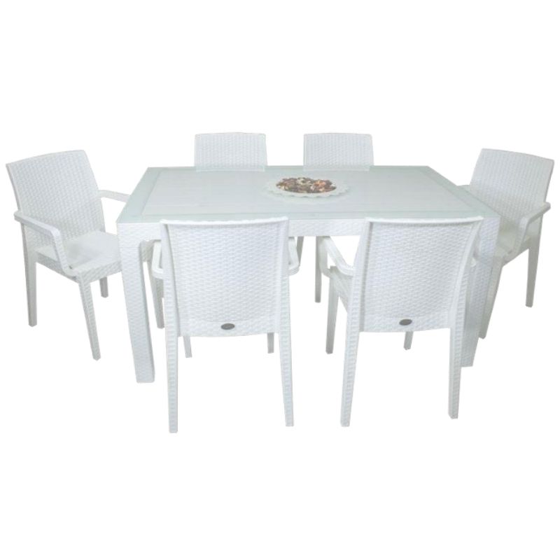 El conjunto incluye 6 sillas con brazos y 1 mesa Arizona Flat con tapa de vidrio templado de 5 mm (80×140 cm). Apto para uso en interiores y exteriores. Todos los productos se entregan embalados en caja.