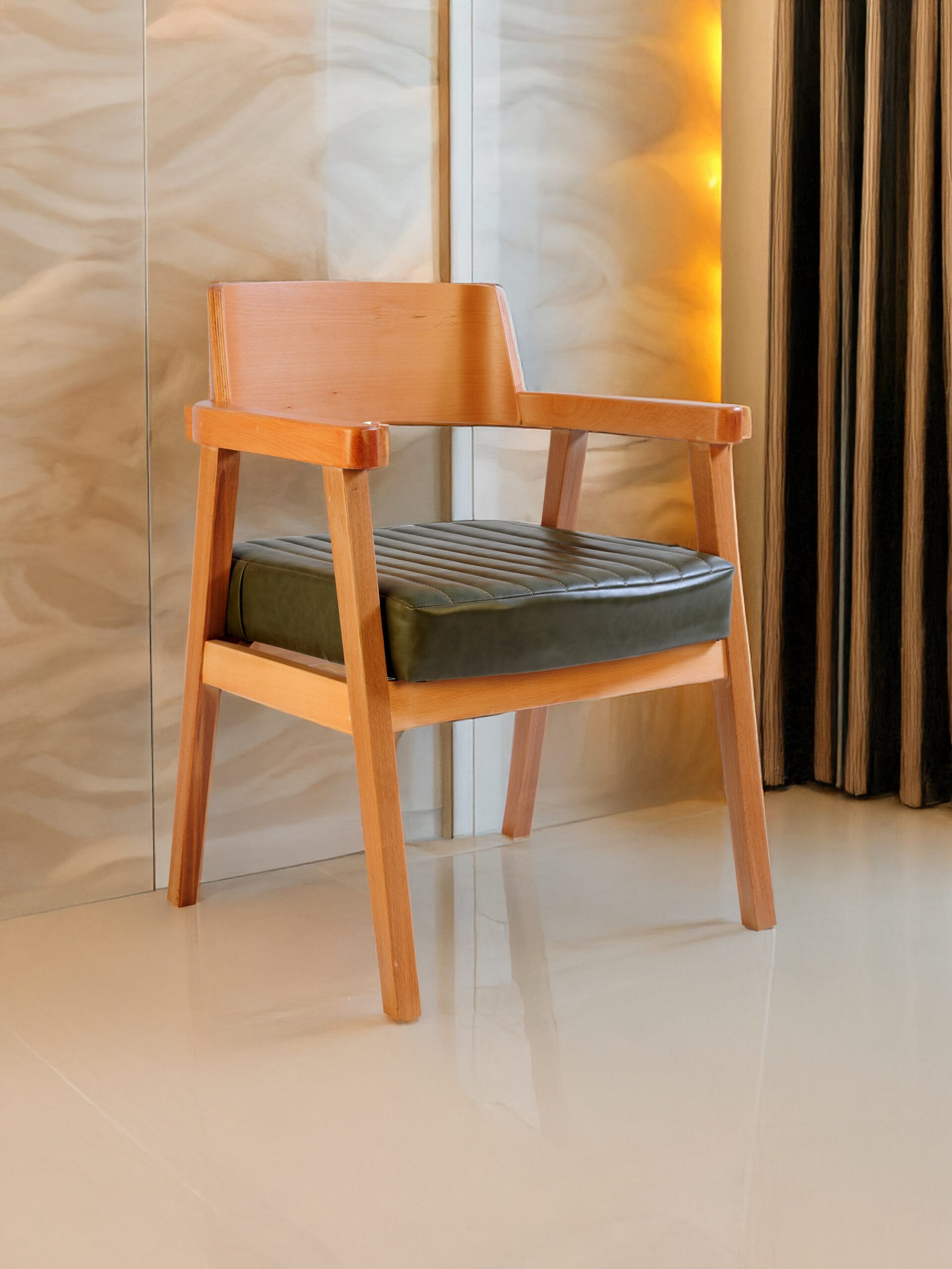 ✅ Fabricado con madera de haya. ✅ Disponible en color nogal o natural. ✅ Opciones variadas de cuero y tela. ✅ Opción de costura en el asiento. Dimensiones: Largo: 54 cm | Ancho: 55 cm | Altura total: 82 cm | Altura del asiento: 47 cm ✅ Cantidad mínima de pedido: 100 unidades.